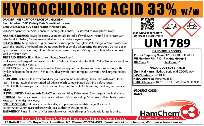 | Trade Name: | Hydrochloric Acid 33% w/w (38% w/v) |